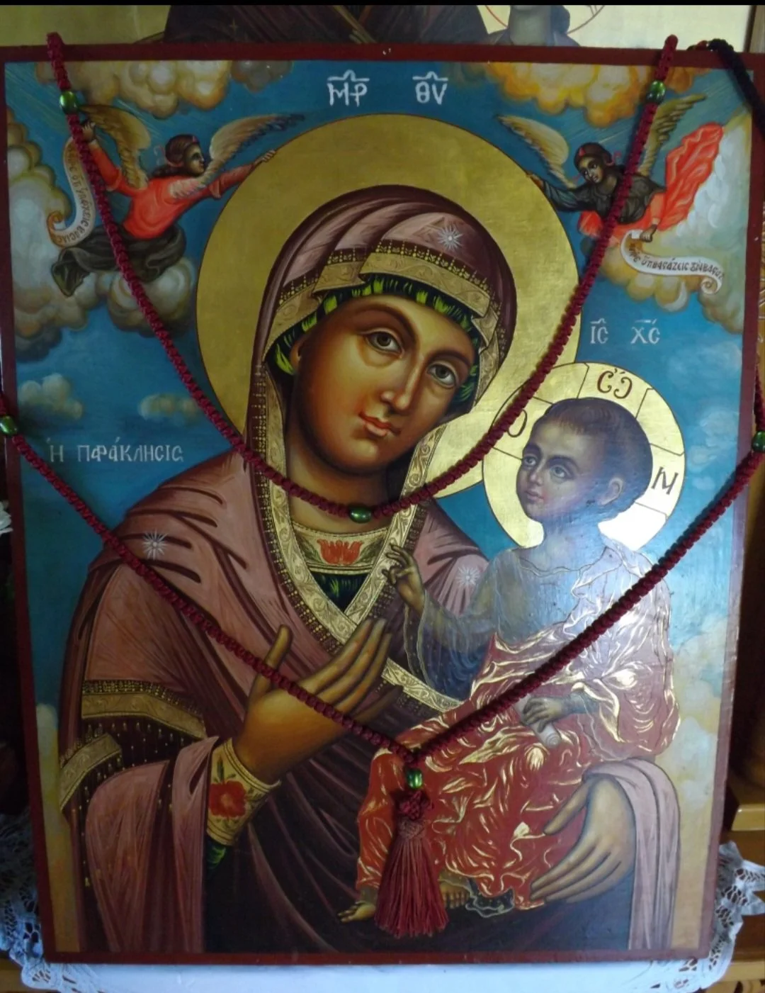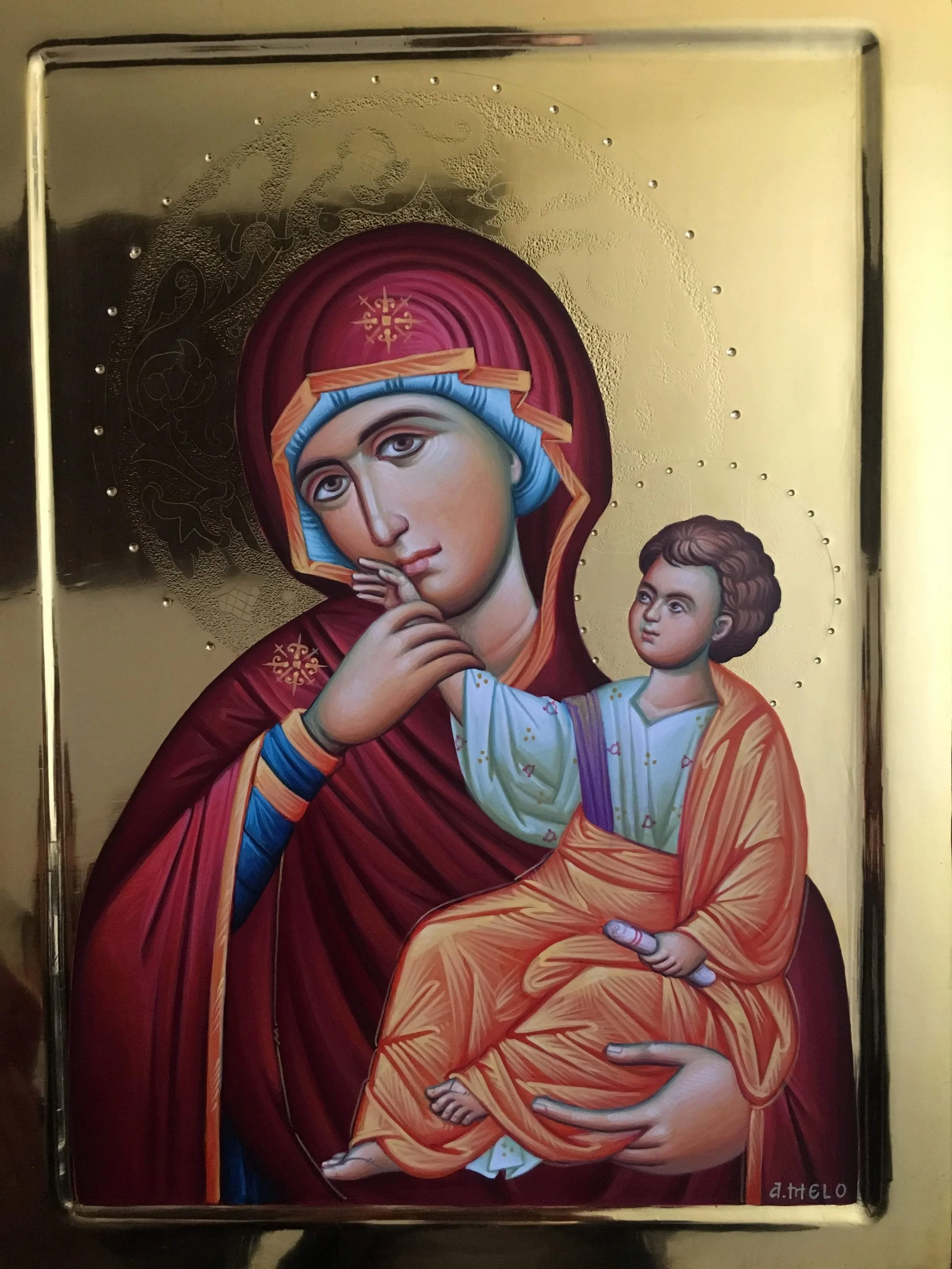 Icon of the Virgin Mary holding the Infant Jesus, both with halos, vibrant colors, and religious symbols.