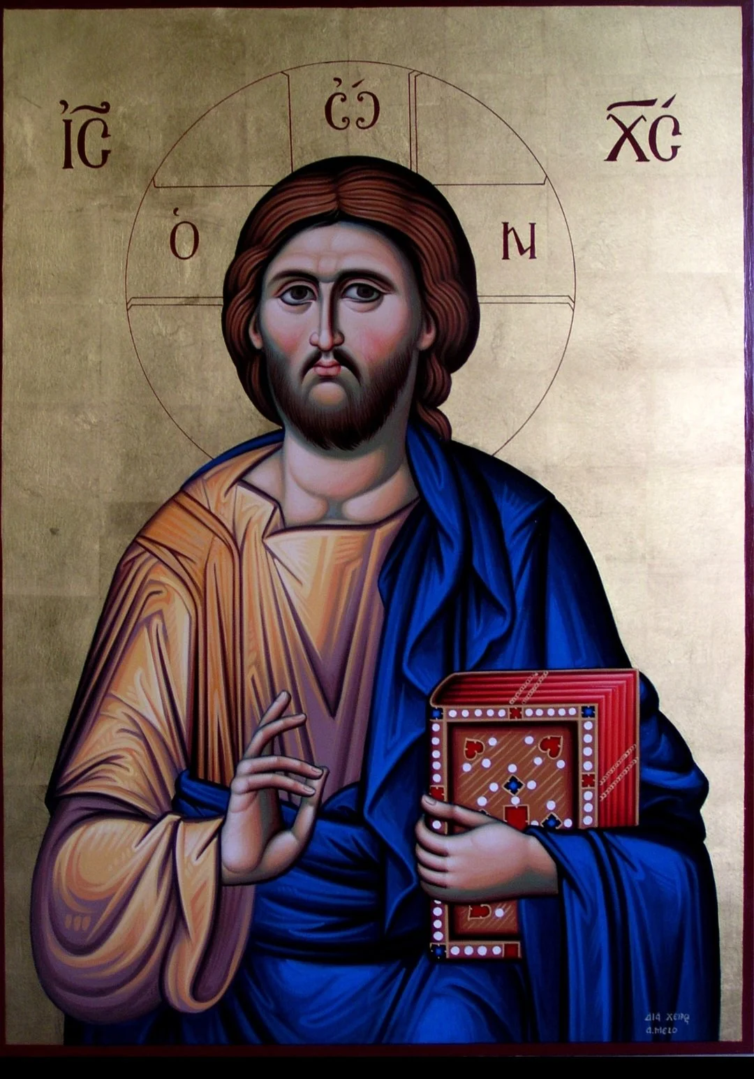 Religious icon of Jesus Christ with a gold background, holding a book in his left hand and making a blessing gesture with his right hand, framed in a gold frame. A memorial plaque at the bottom reads 'In Memory of Christos A. Chipouras'.