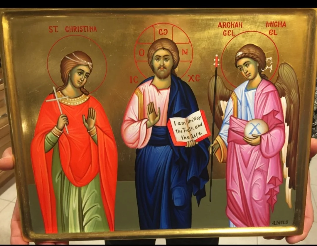 A religious icon painting of the Virgin Mary holding baby Jesus. Both figures have halos, with Mary dressed in red and blue, and Jesus in a yellow robe, holding a scroll.